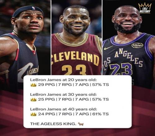 數(shù)據(jù)顯示,詹姆斯20-29歲時(shí)場(chǎng)均29分7籃板7助攻,真實(shí)命中率57%;30-39歲時(shí)場(chǎng)均25分7籃板7助攻,真實(shí)命中率仍保持57%;而40歲至今,他場(chǎng)均能得到24分7籃板7助攻,真實(shí)命中率反而提升至61%。