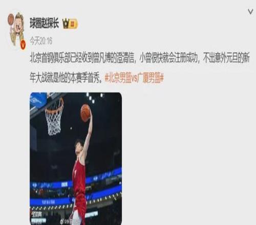 國內知名媒體人報道:北京隊已經收到曾凡博的澄清信,即將注冊完畢。