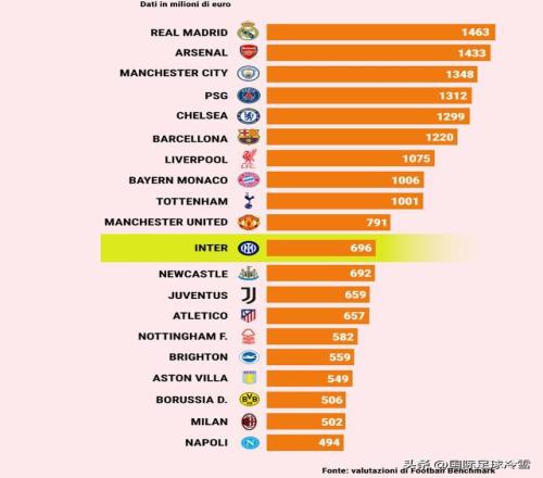 根據(jù)該機(jī)構(gòu)12月的報(bào)告,國米目前的總價(jià)值是6.96億歐元,7億左右,是意甲第一,位列歐洲第11位。